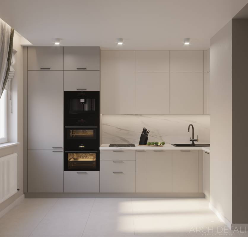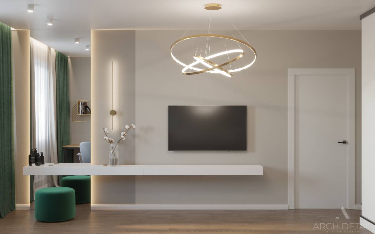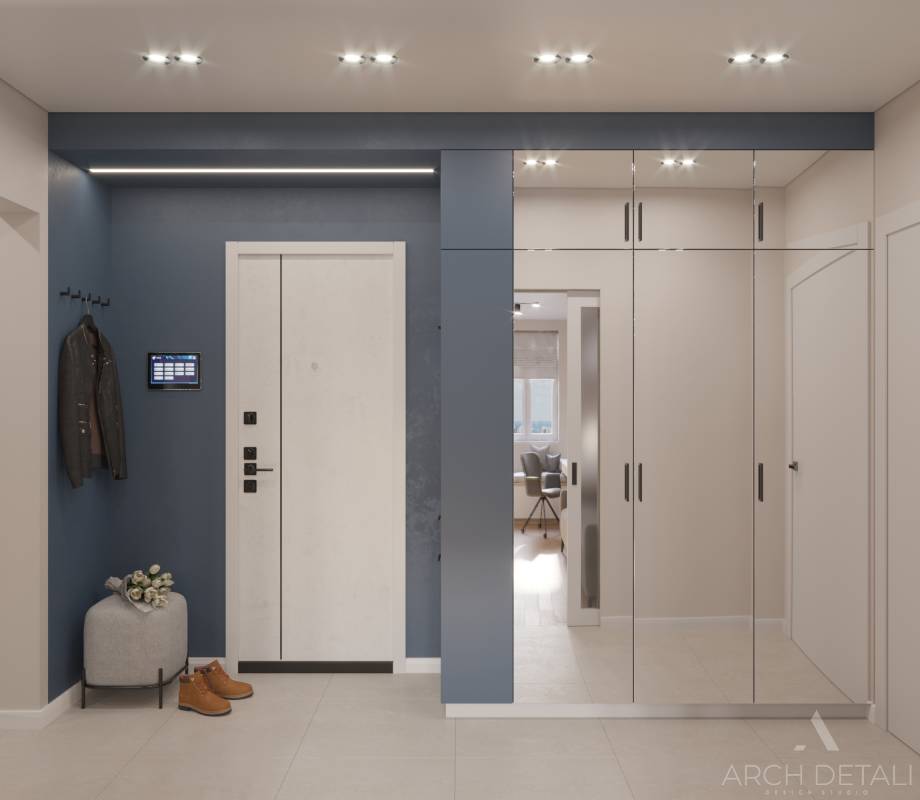 Квартира выполнена в светлых природных тонах с добавлением цветовых акцентов. По желанию заказчиков подобраны разнообразные однотонные декоративные покрытия. Для акцентов в интерьере использовано дерево и черный метал. Обилие сценариев освещения по всей квартире позволяет создавать уникальное настроение для каждой комнаты.