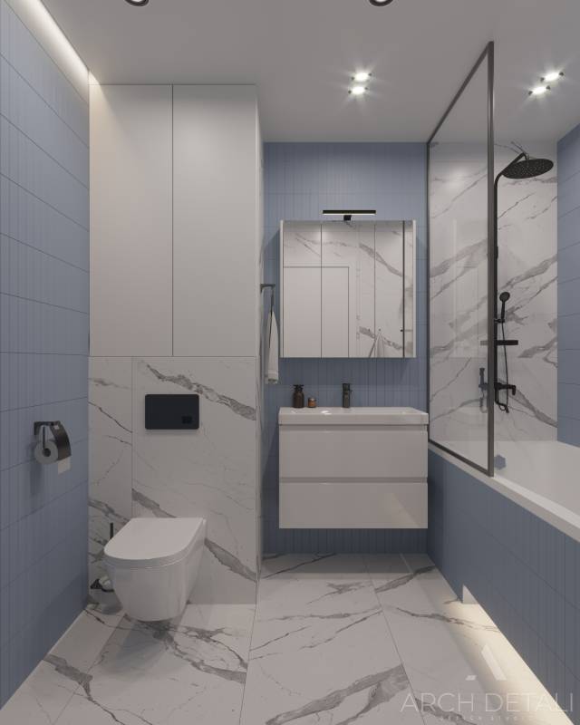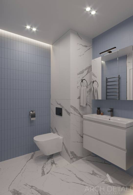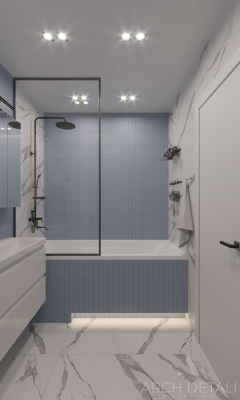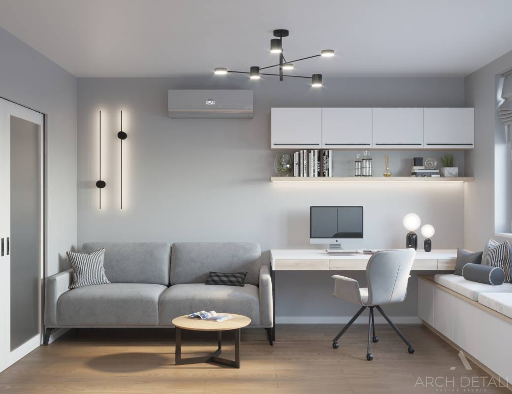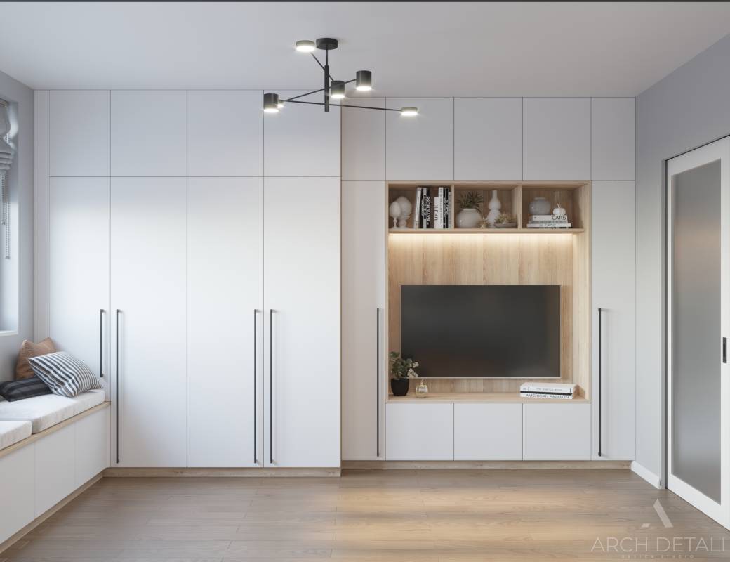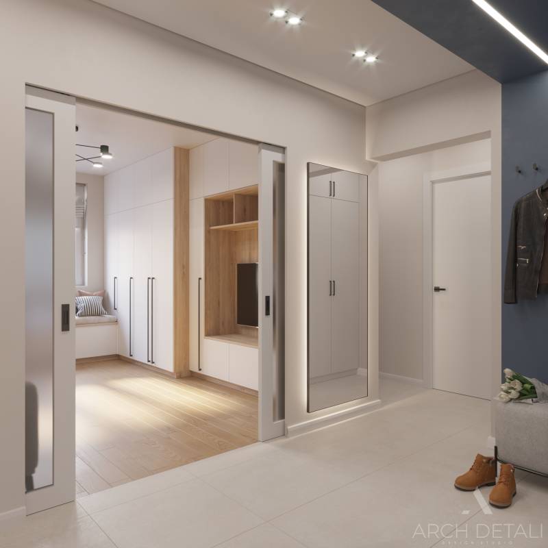 На 55 кв.м. жилой площади был запроектирован просторный кабинет, удачно совмещающий в себе функции гостиной комнаты, а замена распашной двери на скрытые раздвижные двери визуально и физически увеличила внутреннее пространство помещения. Обилие зеркал в зоне прихожей добавило объема и воздуха узкому пространству. В спальне максимально сохранена существующая мебель заказчика, которую грамотно вписали в новый дизайн квартиры, дополнив помещение световыми и декоративными элементами. Санузел был объединен с учетом пожеланий заказчиков. В прихожей удачно расположился хозяйственный шкаф, в котором удалось разместить стиральную и сушильную машины, накопительный водонагреватель, и многофункциональную систему хранения.