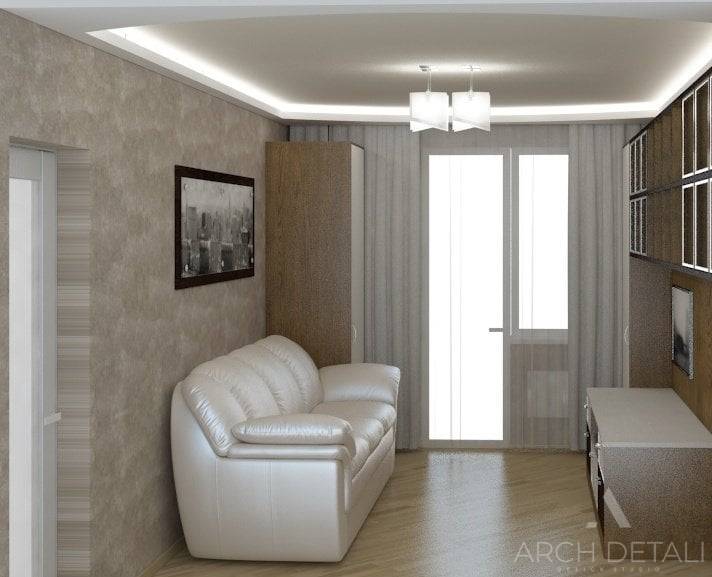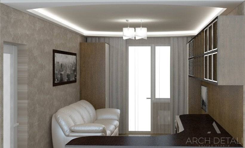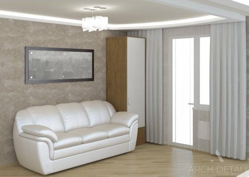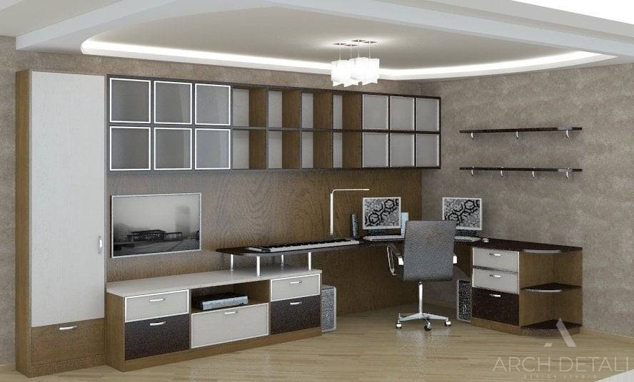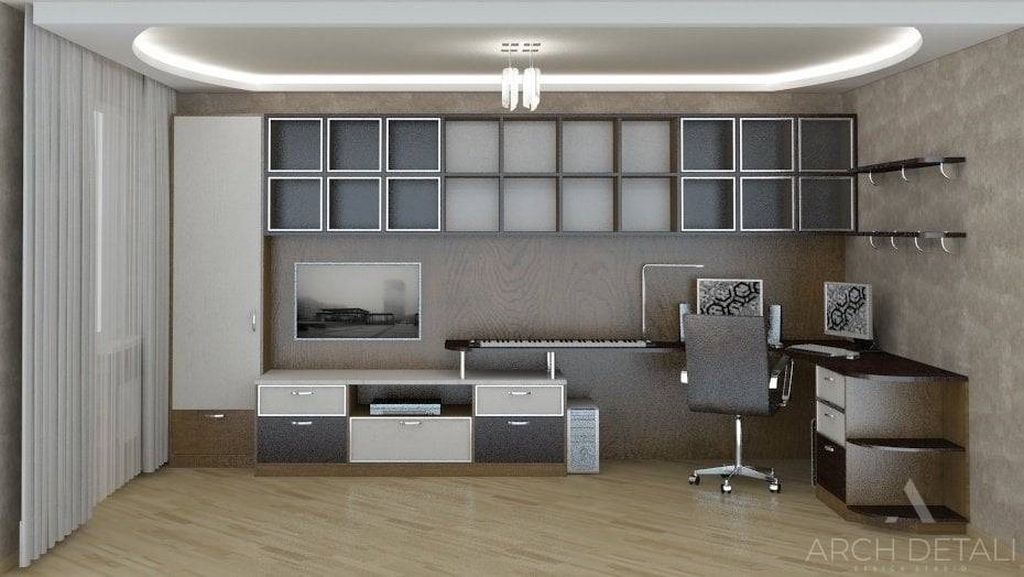 Гостиная для удобства и функциональности поделена на две зоны. Зону отдыха украшает белый кожаный диван, рабочей зоне выделена целая стена. Здесь разместился и музыкальный инструмент, и компьютерный стол, и удобные полки для книг и документов.