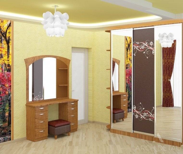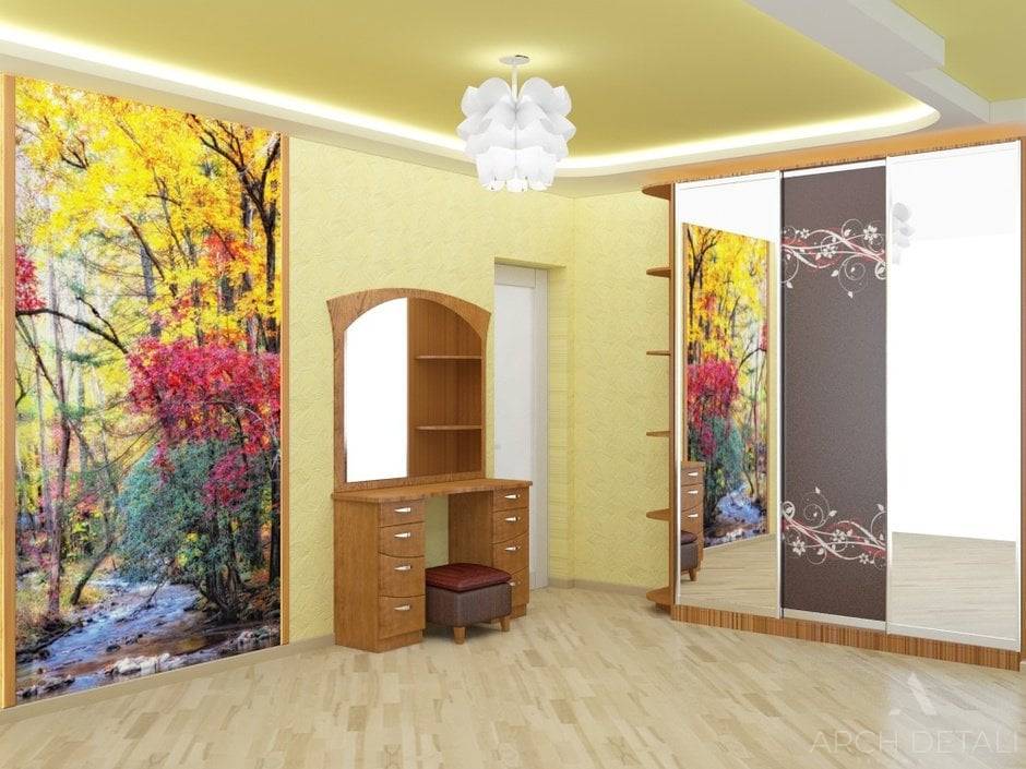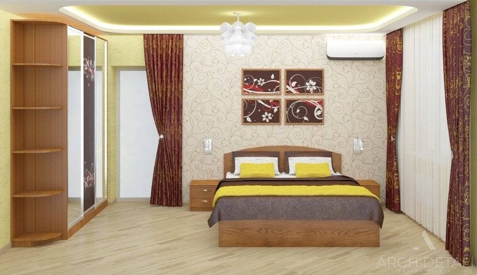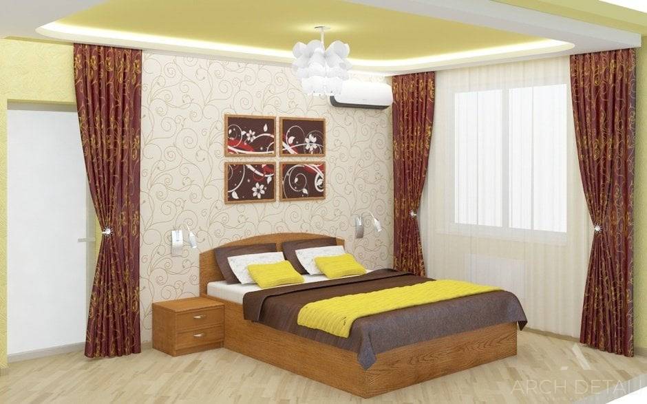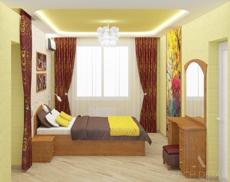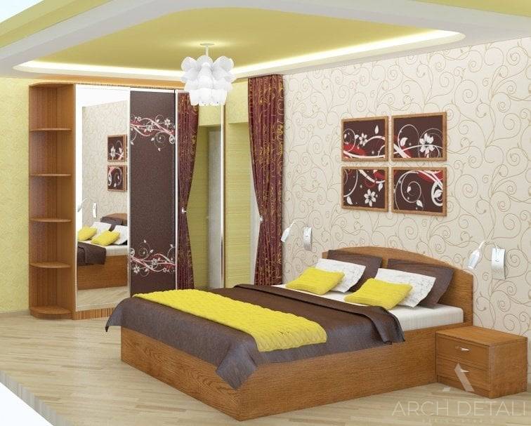А вот спальня получилась яркой и оригинальной. Двуспальную кровать цвета венге украшает яркий текстиль в тон с представленными шторами. Многоуровневый потолок вбирает два цвета – матовый белый и светло-желтый. Напольное покрытие, как и в гостиной – ламинат. Одну из стен декорировали обоями с рисунком. Над прикроватными тумбами установили бра.