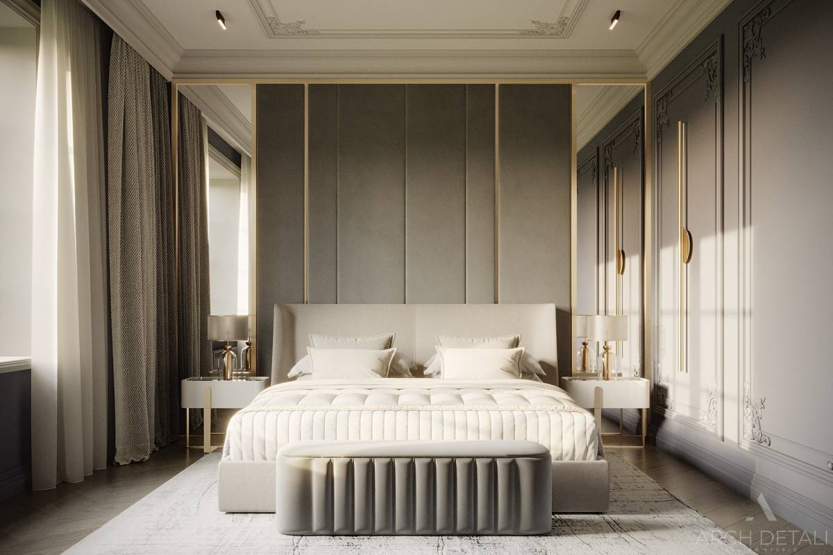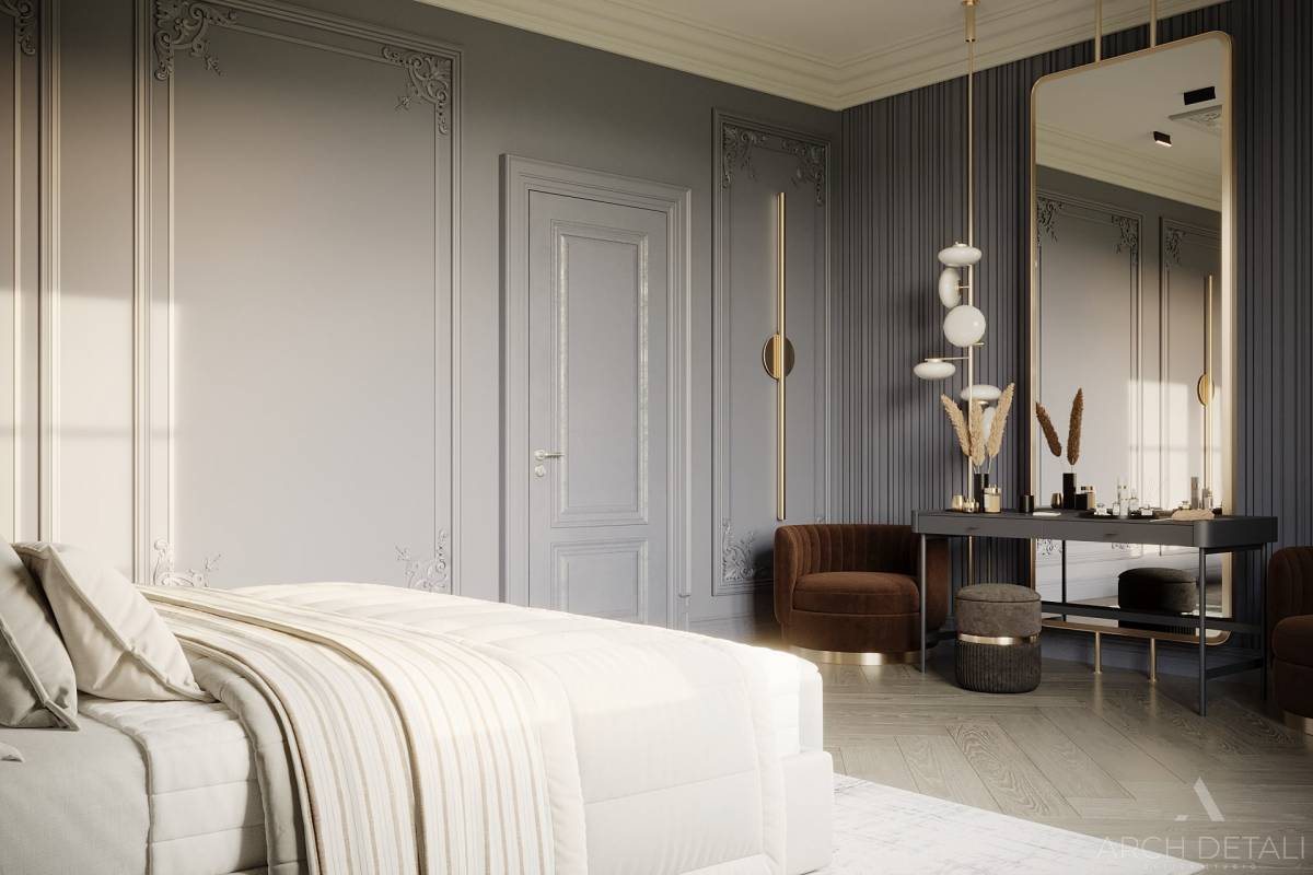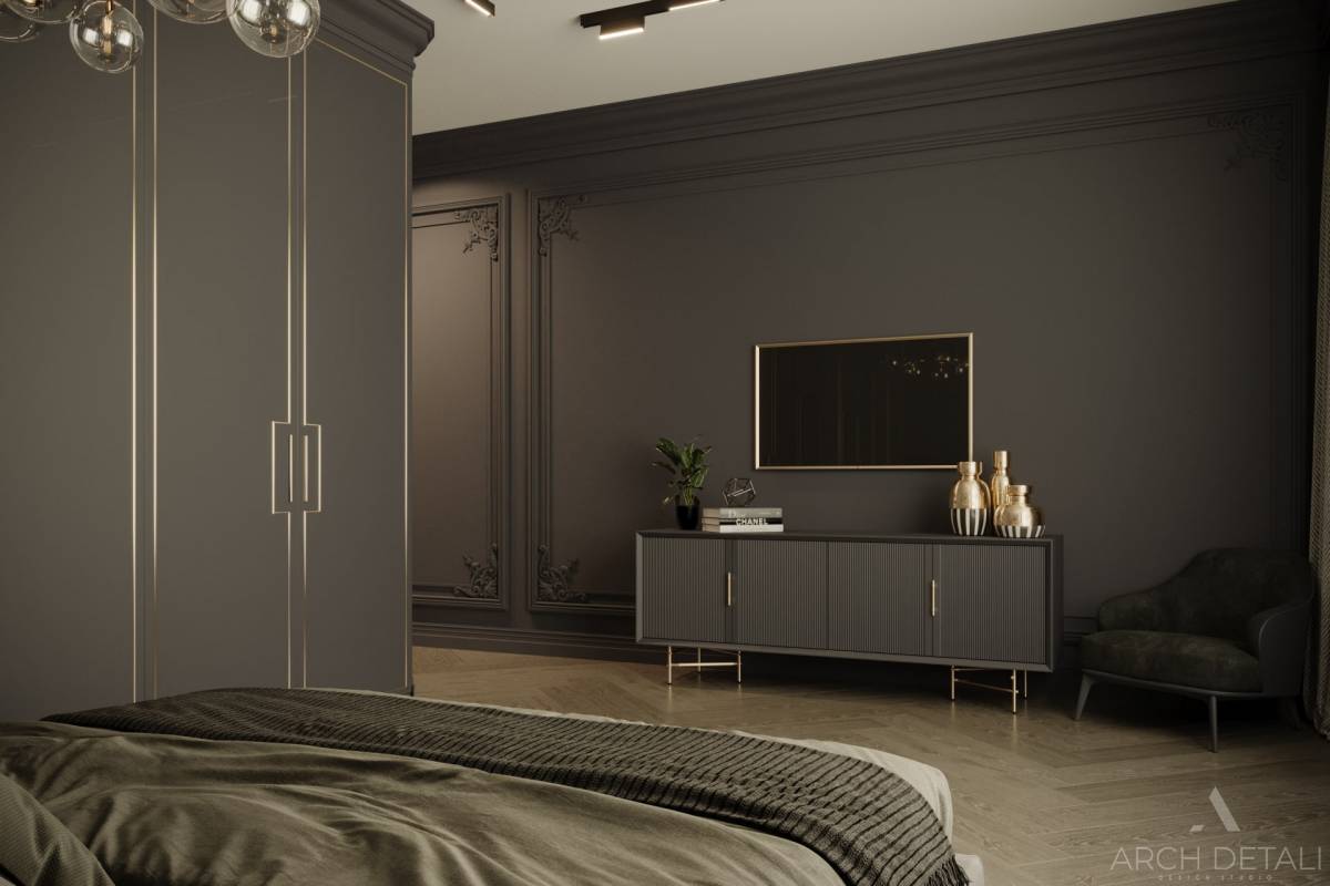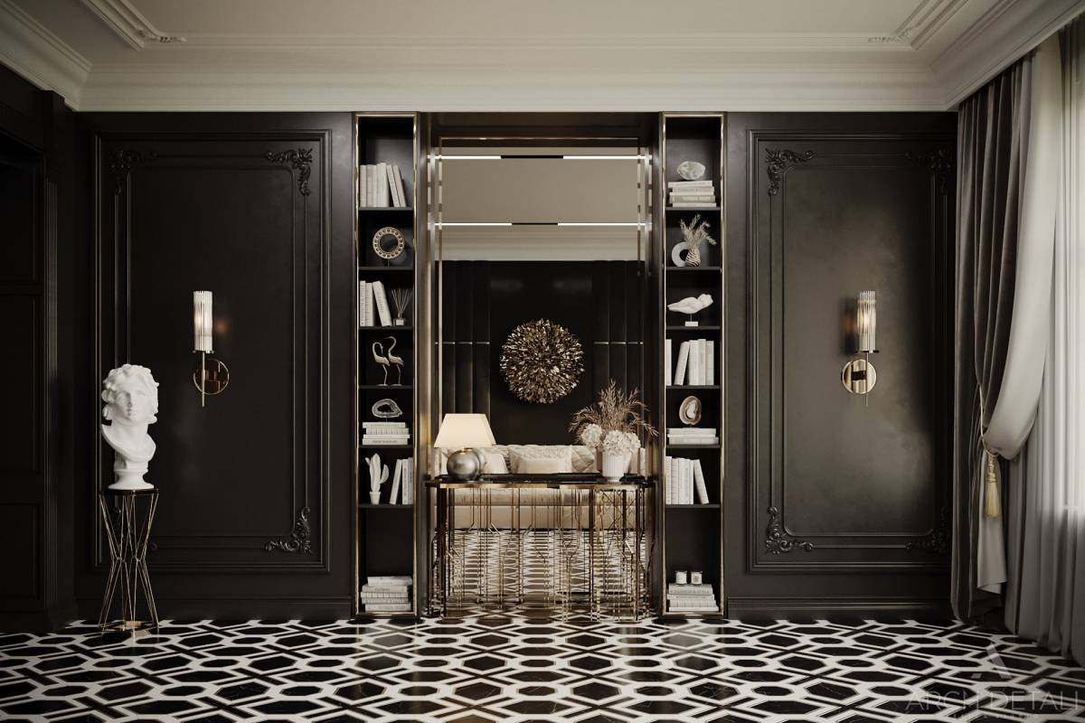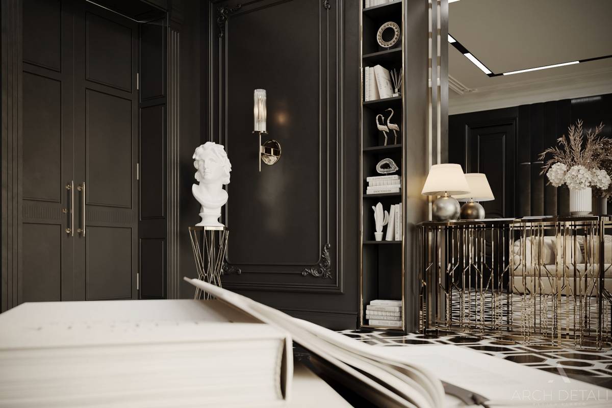 Молдинги на стенах, выкрашенные в темные цвета, создают уютную атмосферу.