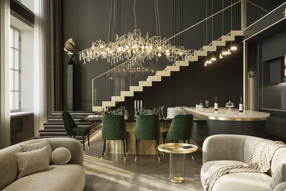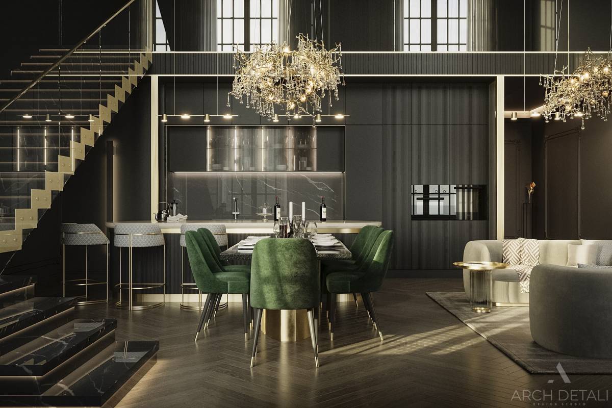 Большие люстры над гостиной и обеденной группой визуально зонируют пространство и создают приятный рассеянный свет.