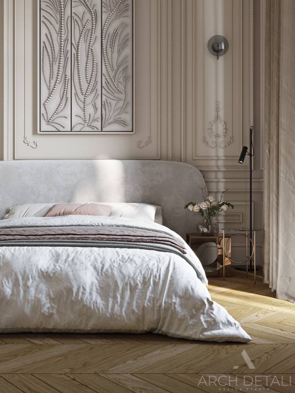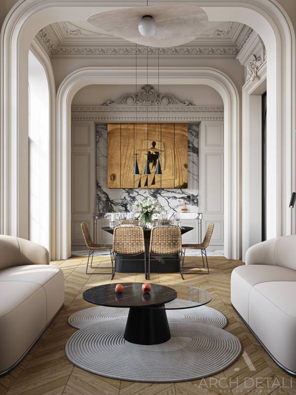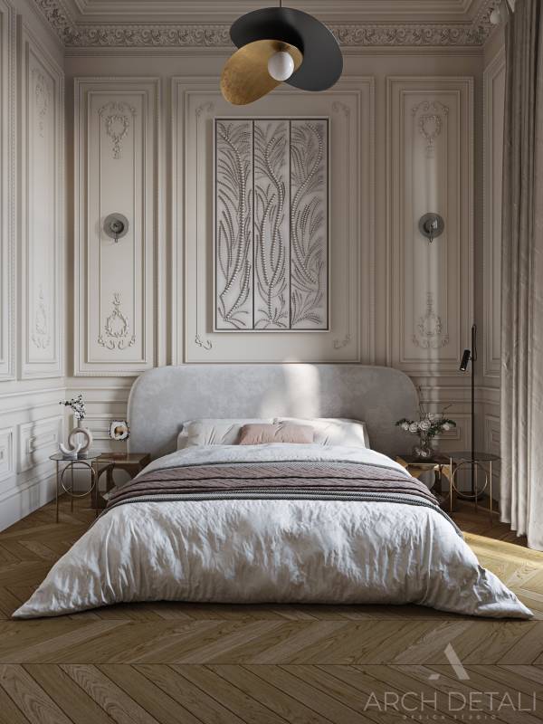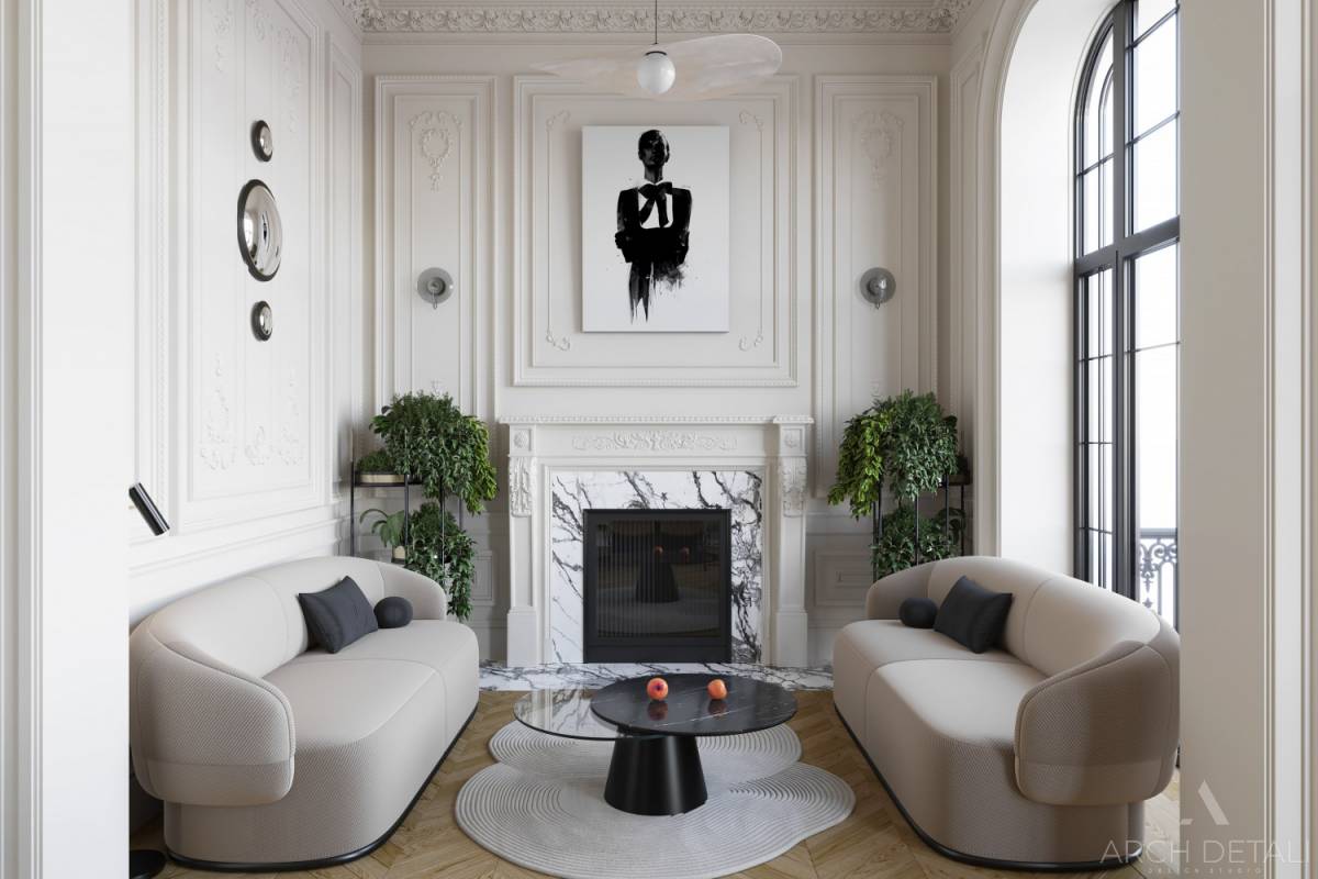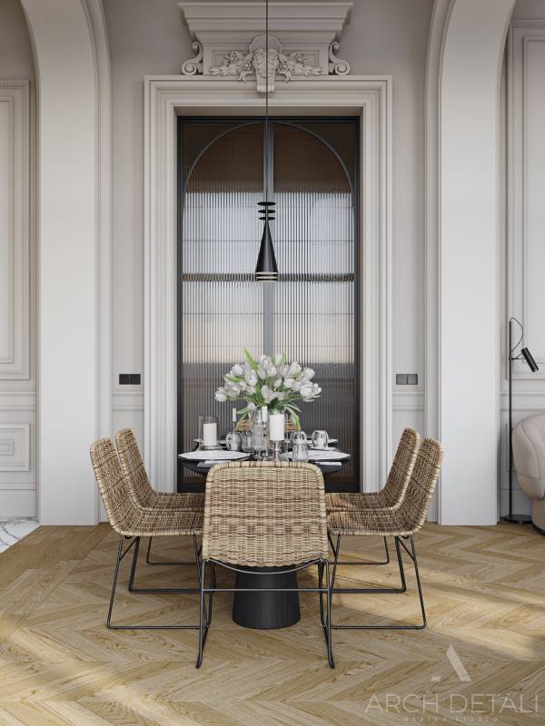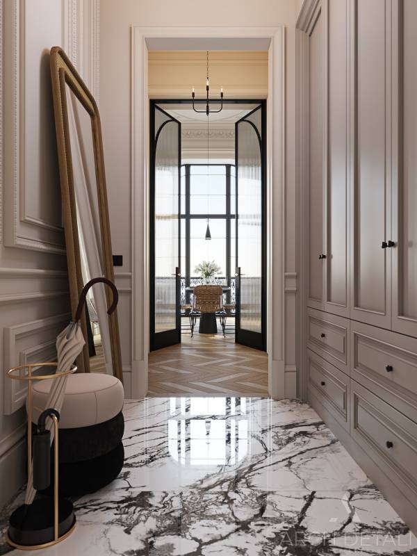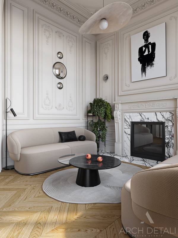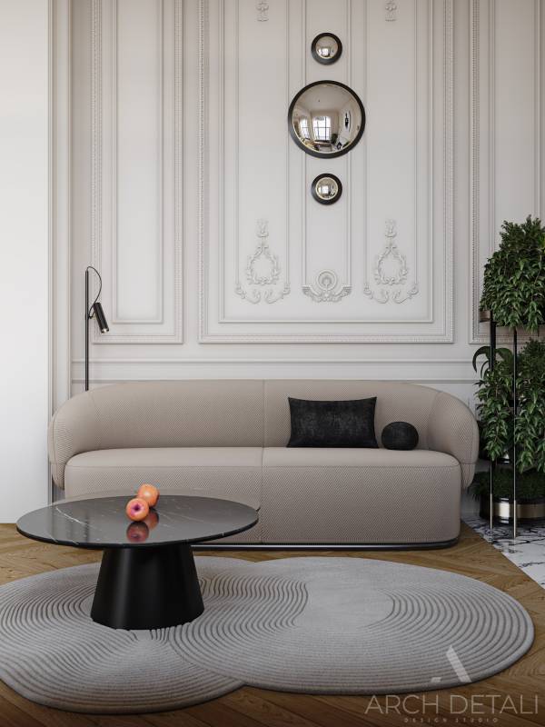 Проект «Питерский шарм» от студии Arch Detali представляет собой гармоничное сочетание классических и современных элементов, отражающих атмосферу Санкт-Петербурга. Интерьер выполнен в светлых тонах с акцентами на изысканные детали, создавая уютное и стильное пространство для комфортной жизни.