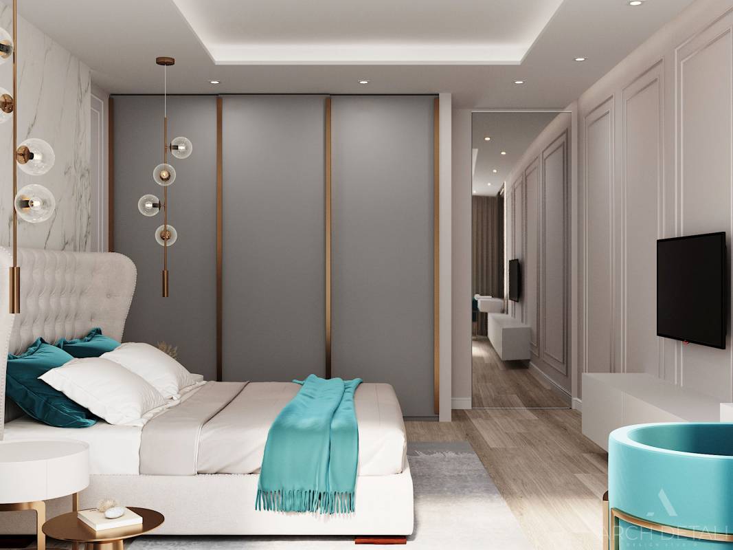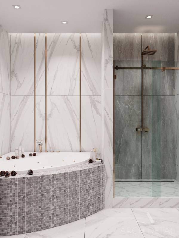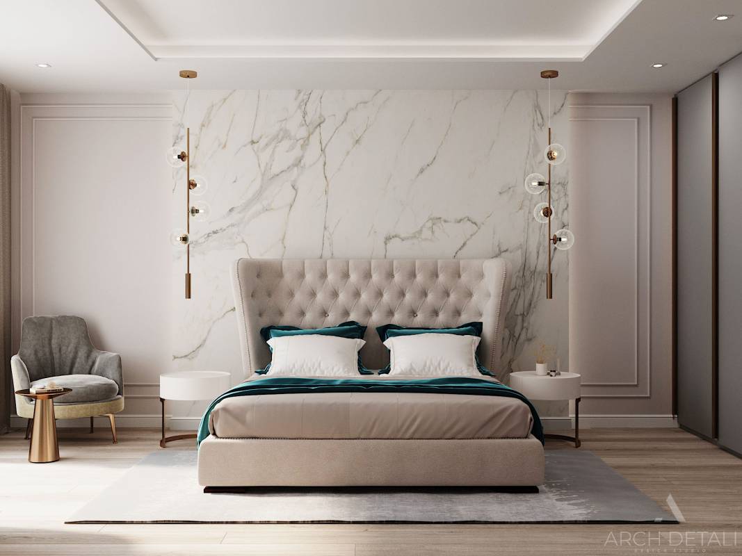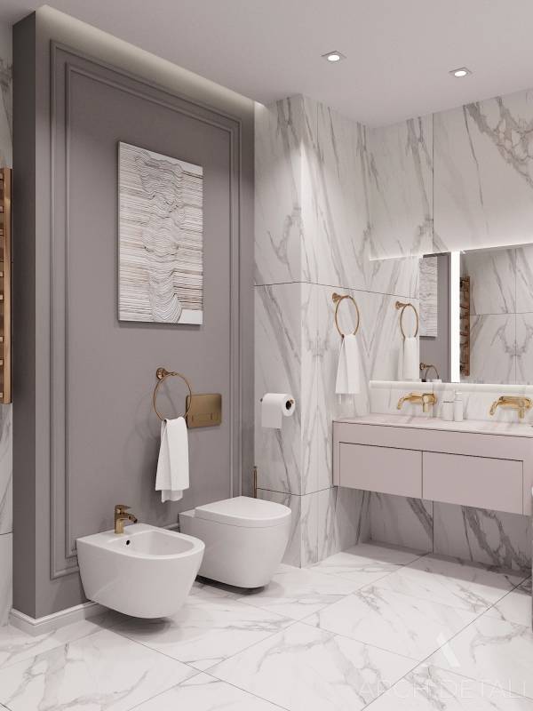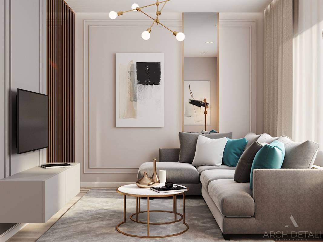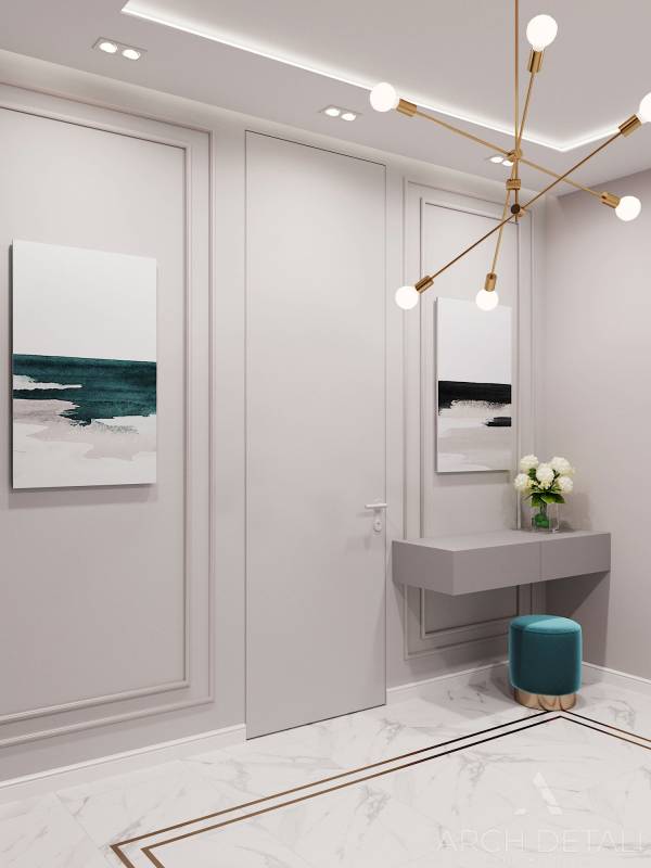 Интерьер разработан в современном стиле сочетающий в себе элементы разных стилей: строгие минималистичные формы, в сочетании с классическими элементами в отделке.