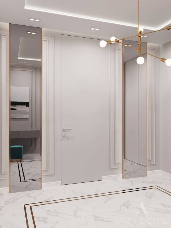 Интерьер просторный воздушный. Высоту помещений подчеркивают такие приемы в дизайне, как использование дверей до уровня потолка, использование вертикальной светодиодной подсветки стен, декоративные вставки в отделке из латуни.