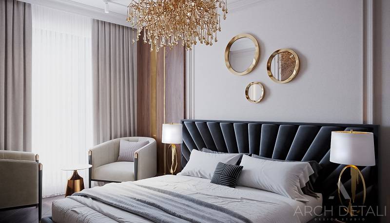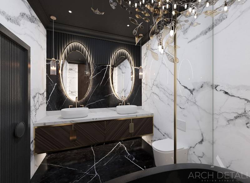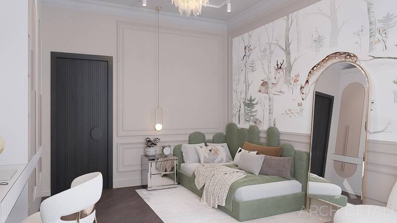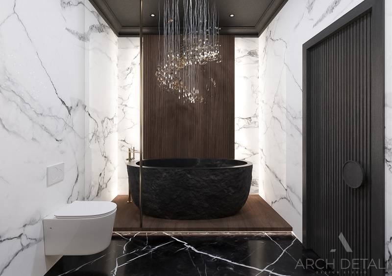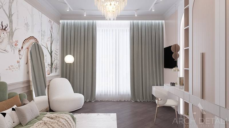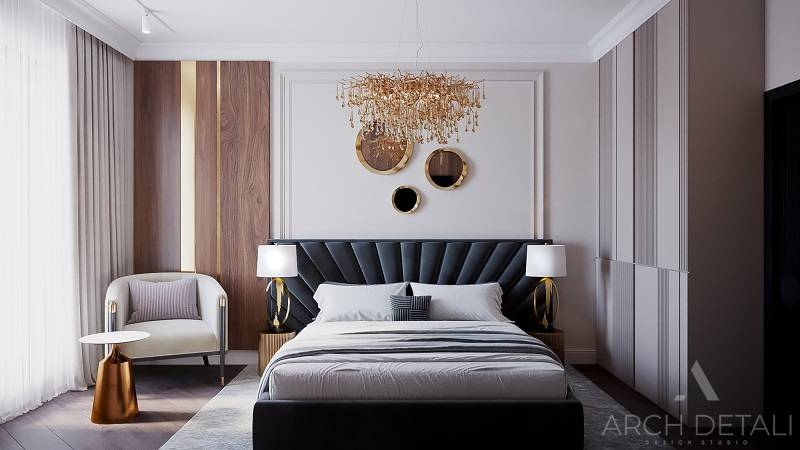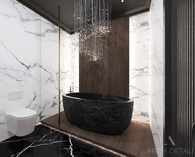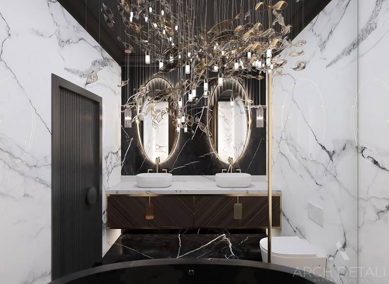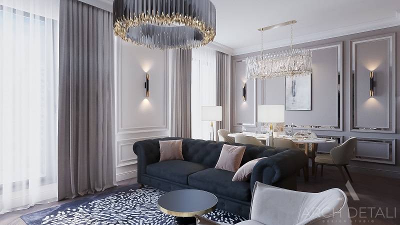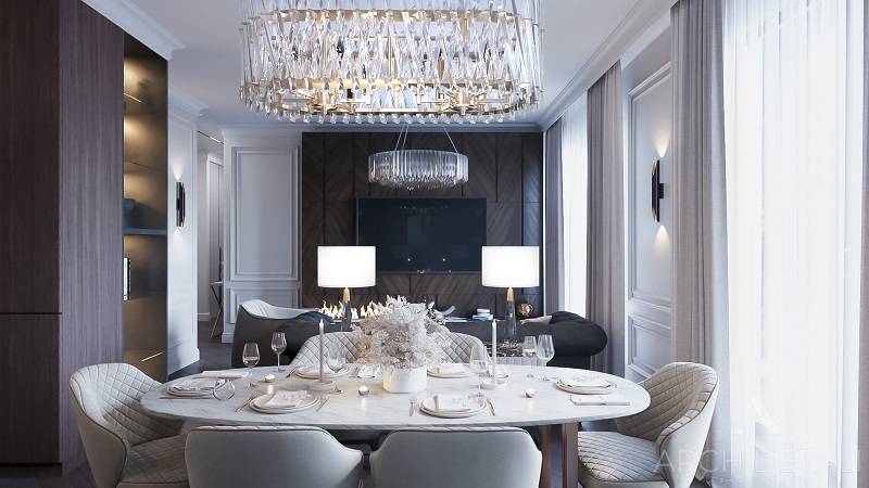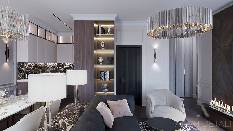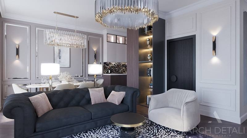 Интерьер выполнен в стилистике арт-деко. Квартира спроектирована для семейной пары с дочерью 14 лет. Кухня-гостиная выполнена в пастельных тонах с использованием деревянных панелей и мрамора в виде акцентов. Центром ванной комнаты является "парящий" подиум с ванной из черного камня и высоким напольным смесителем. В отделке стен ванной комнаты использованы контрастные белый и черный мрамор. Как акценты, в помощь выбранному стилю, добавлены элементы декора.