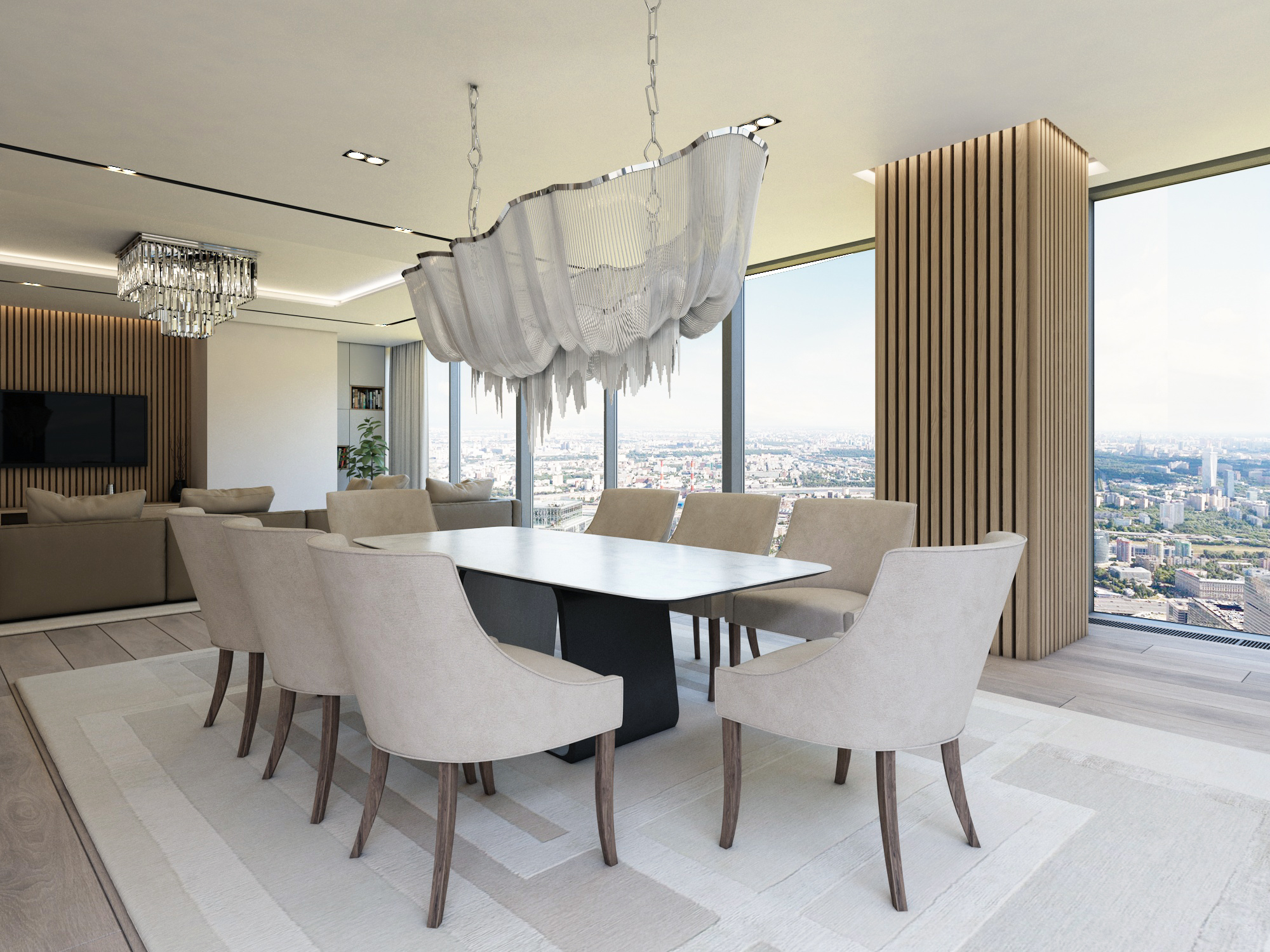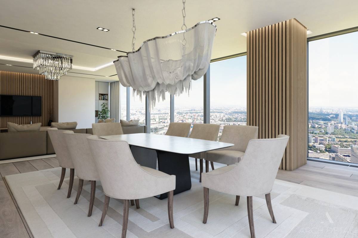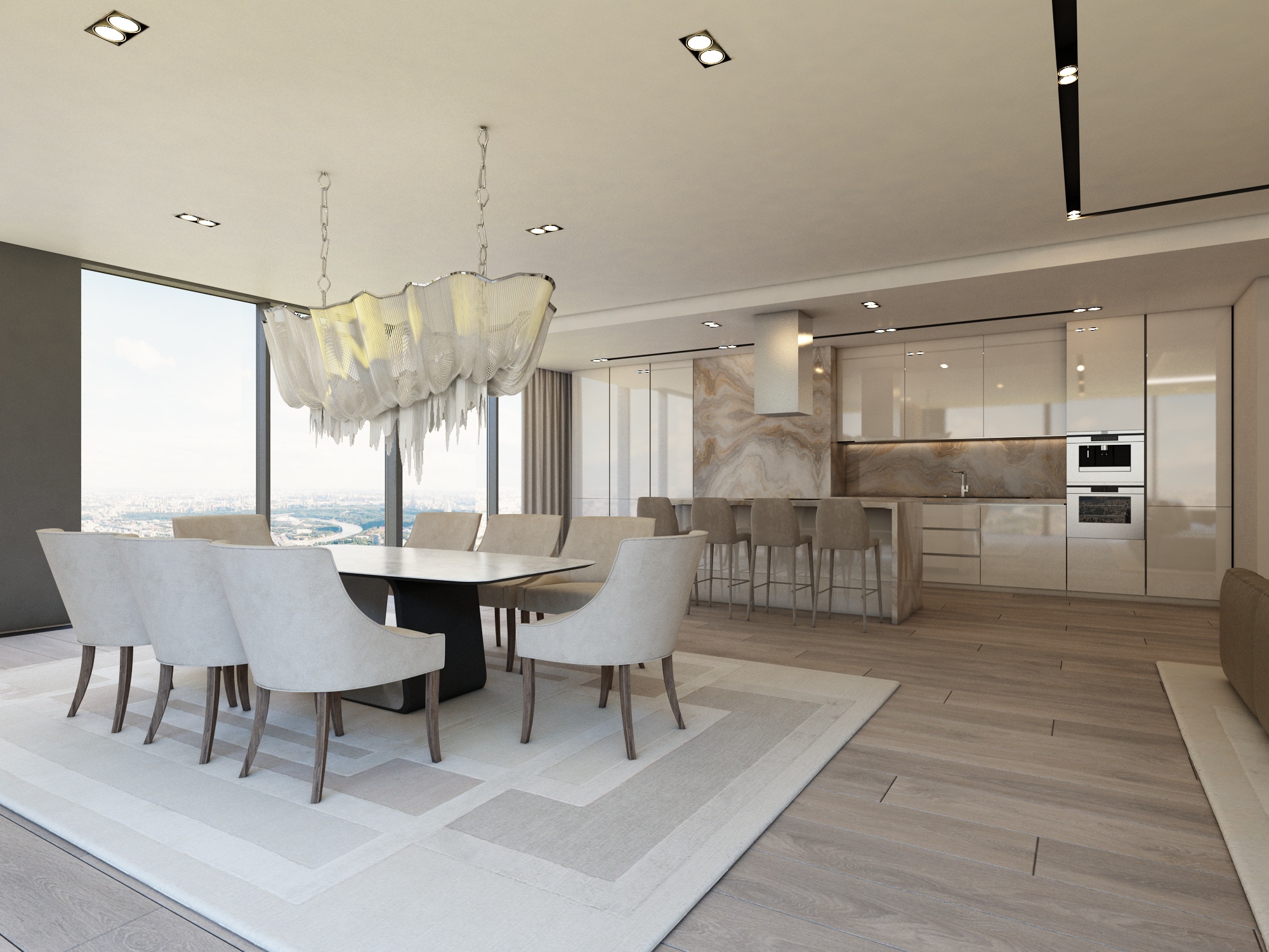 Этот дизайн-проект просторной трехкомнатной квартиры площадью 207 м2 расположен на верхнем этаже элитного жилого комплекса "Башня Санкт-Петербург" в Москва-Сити. Интерьер выполнен в элегантном классическом стиле с использованием натуральных материалов. Парадная прихожая с зоной хранения ведет в роскошную гостиную с камином, мягкой мебелью и панорамным остеклением. Стильная изолированная кухня оборудована встроенной техникой и кухонным гарнитуром ручной работы. Отдельно выделены столовая зона и кабинет. Две просторные спальни с ванными комнатами оформлены в единой пастельной цветовой гамме. Обилие натурального света, панорамные виды, изысканный декор и мебель премиум класса позволили создать в этой квартире атмосферу роскоши и комфорта.