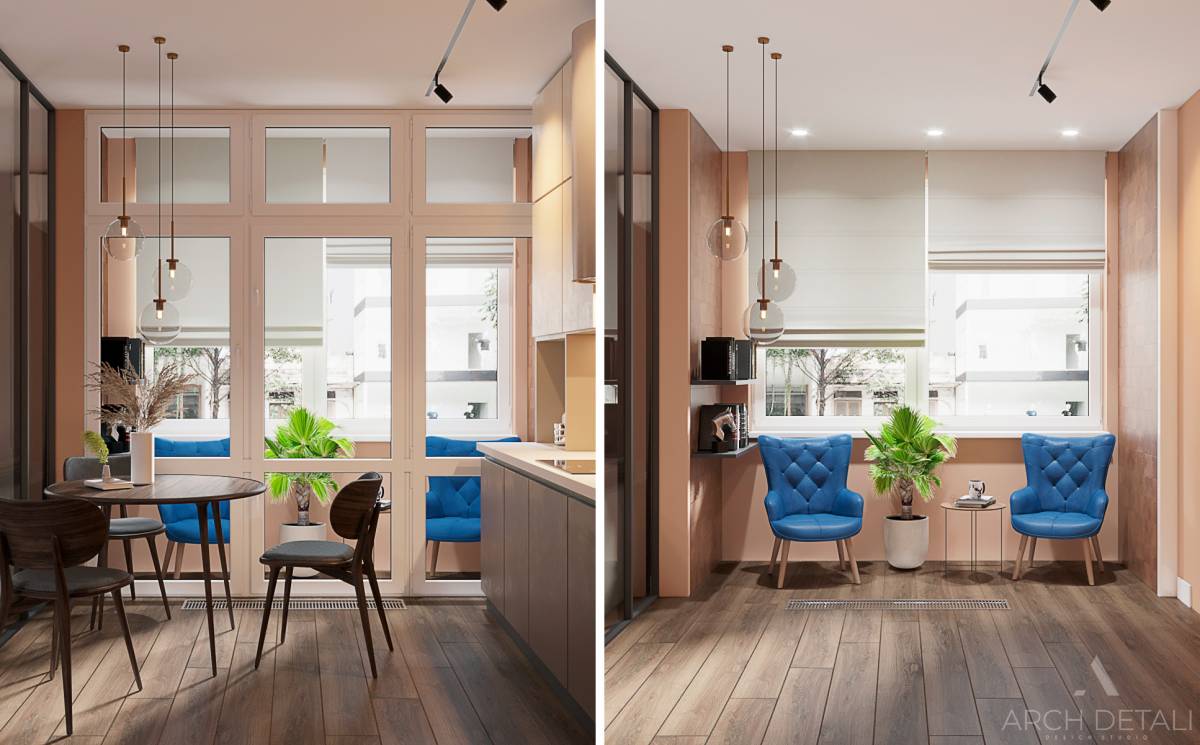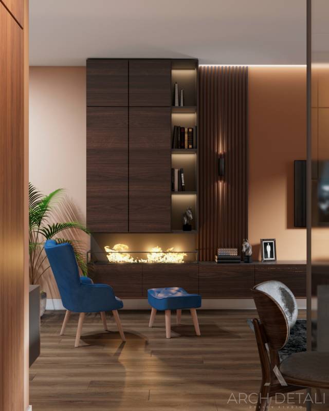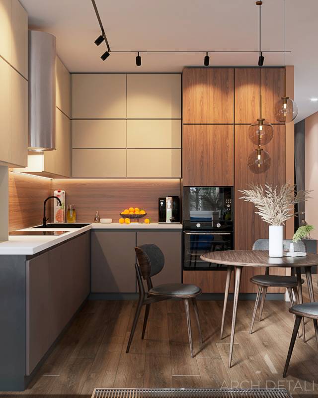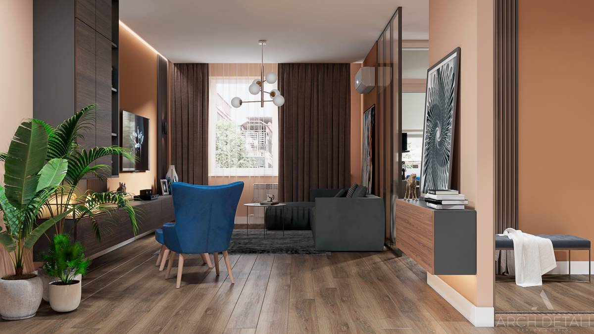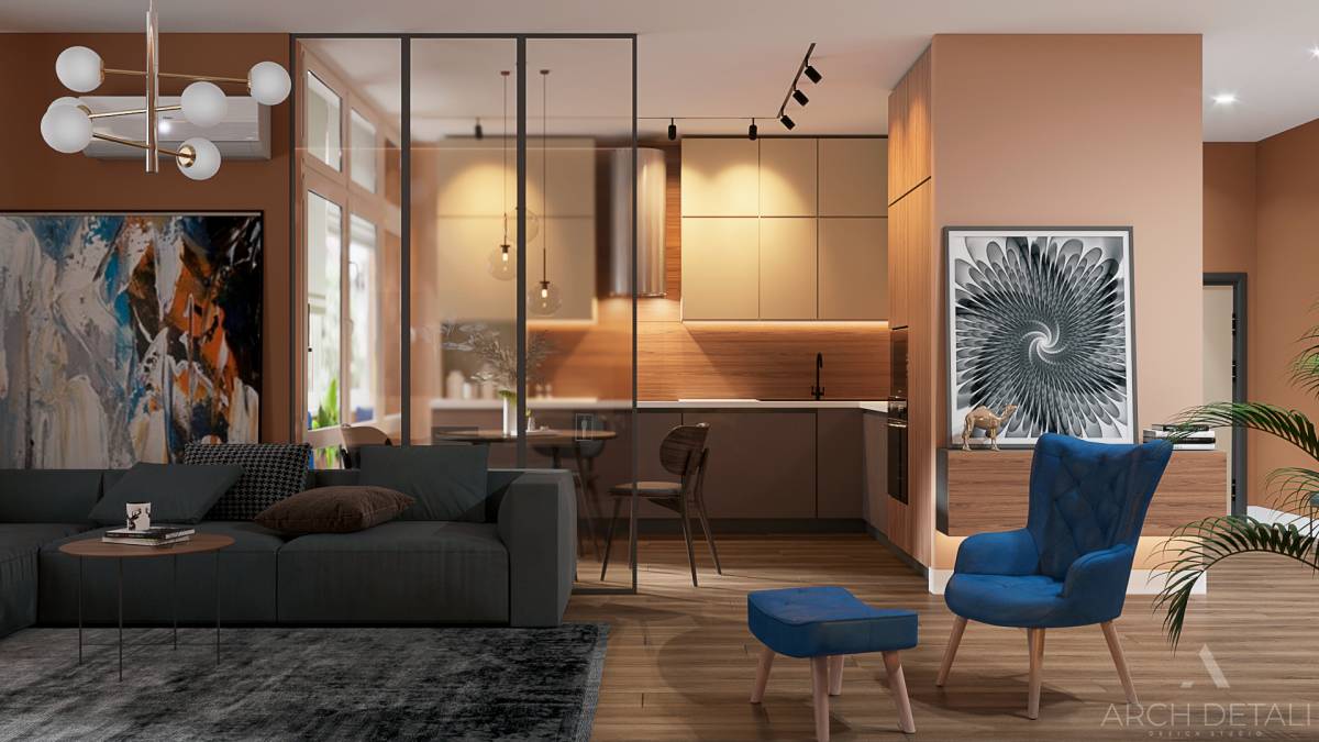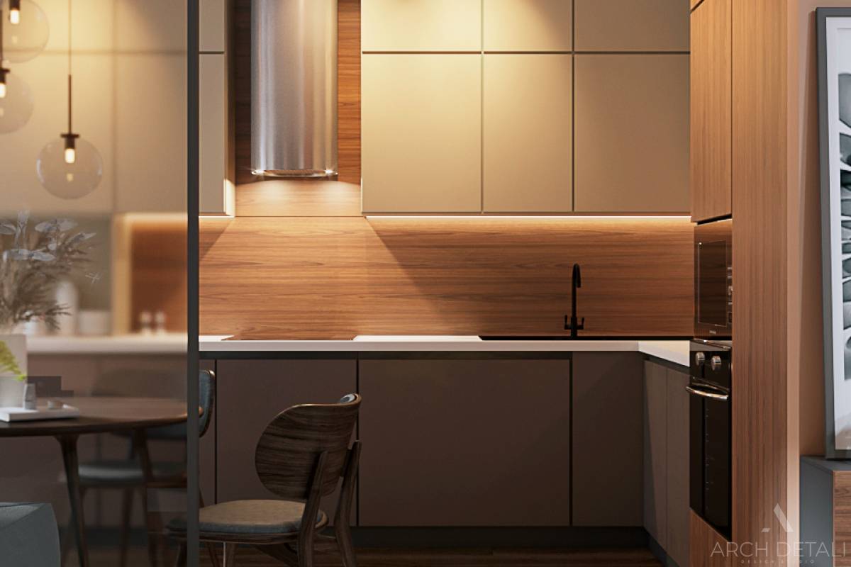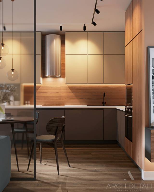 Прихожая органично связана с кухней-гостиной за счет использования единого напольного покрытия. На кухне оптимально размещены все необходимые рабочие зоны и встроенная техника. Для отделки использованы фасады из натурального дерева и стекла. В гостиной комфортно расположились диван, кресла и журнальный столик.
