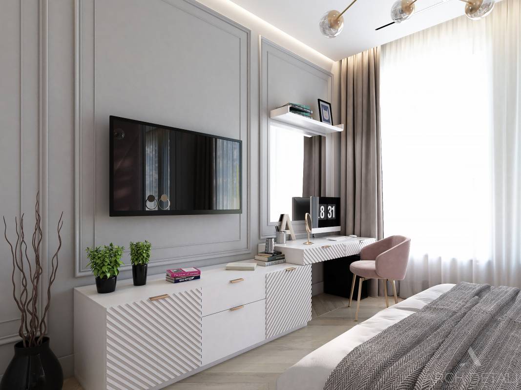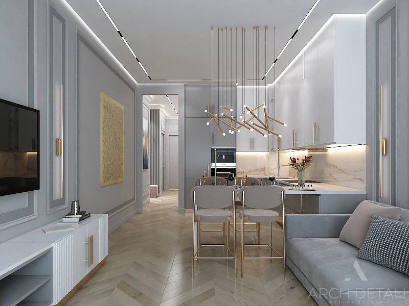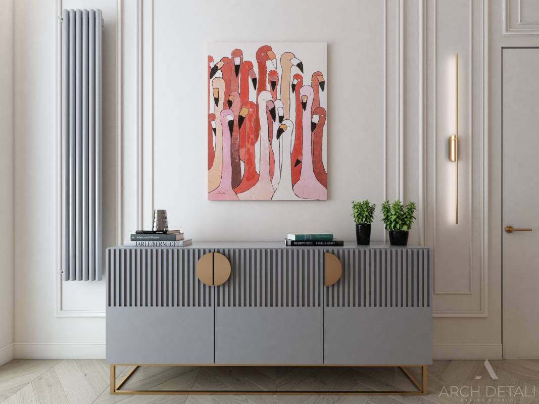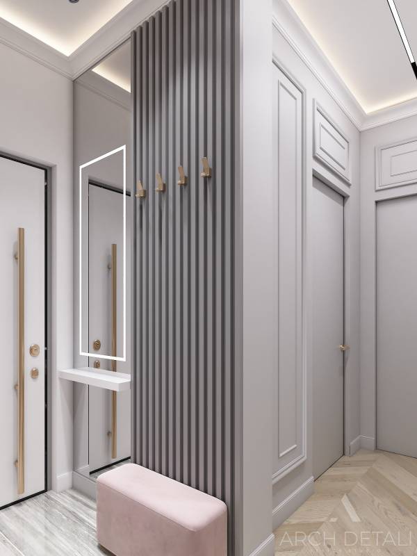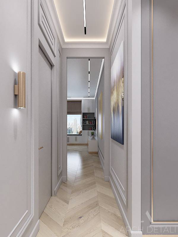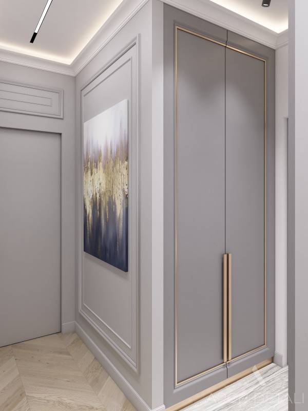 Интерьер выполнен в модном стиле «неоклассика». В оформлении всех стен в этой квартире использованы покраска и молдинги, разбавленные зеркальными панелями. Светлые тепло-серые тона пространства придают воздушность всему интерьеру. Все отлично сочетается с классической укладкой паркетной доски «французской елкой» и контрастной плиткой в санузлах.