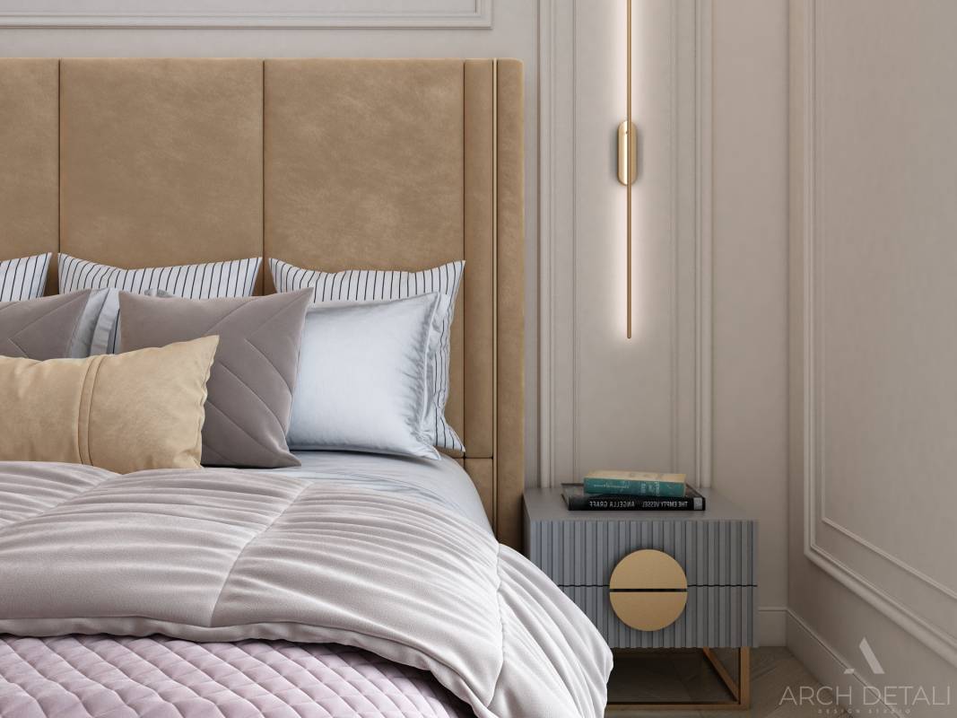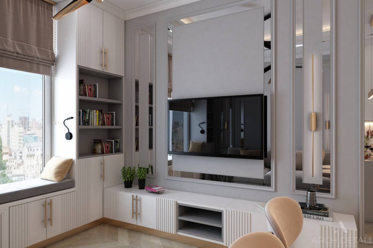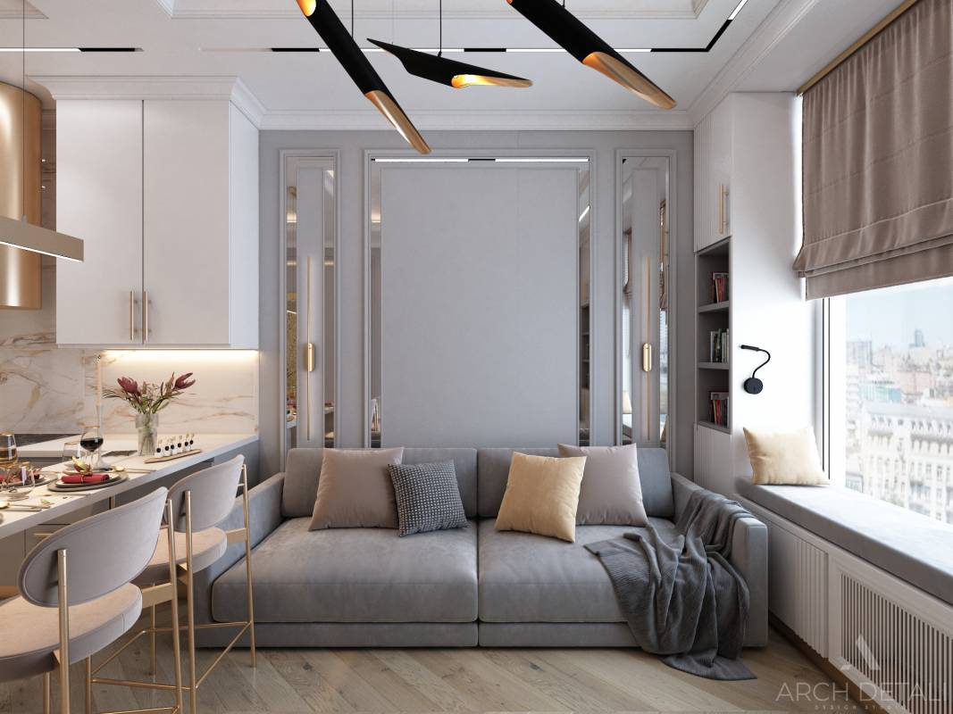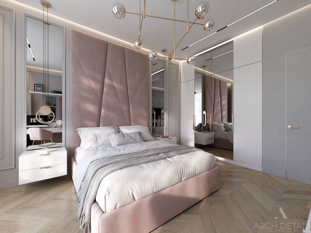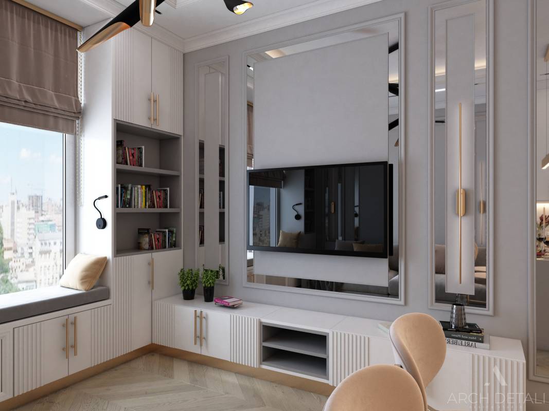 Интерьер выполнен в модном стиле «неоклассика». В оформлении всех стен в этой квартире использованы покраска и молдинги, разбавленные зеркальными панелями. Светлые тепло-серые тона пространства придают воздушность всему интерьеру. Все отлично сочетается с классической укладкой паркетной доски «французской елкой» и контрастной плиткой в санузлах.