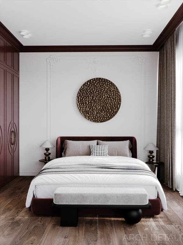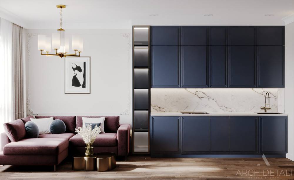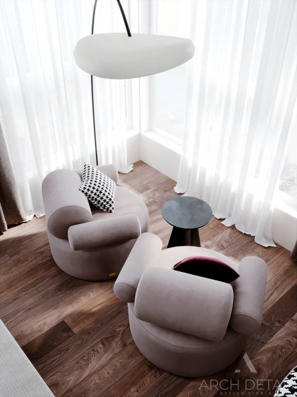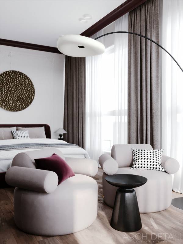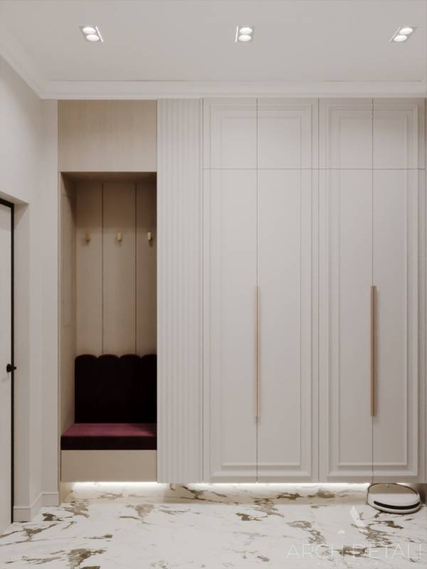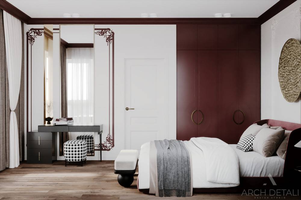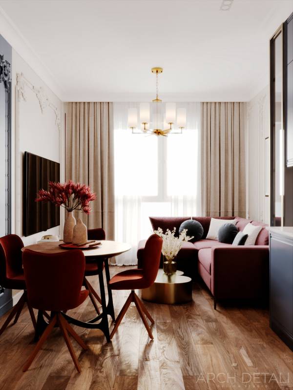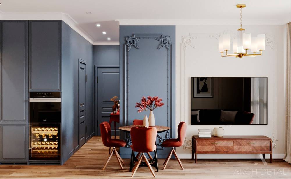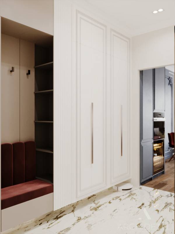 Сложность и акцент геометрии пространства квартиры дает яркий серо-синий оттенок в отделке стен, объединяющий кухню и коридор и создающий направление движения от входной зоны к дальним комнатам. Прихожая и гостиная на контрасте выделены белым цветом . Тем самым в одном пространстве можно объединить разные по функционалу зоны: кухни, обеденной зоны, гостиной, выделяя их колористическими решениями и отделочными материалами, не выстраивая при этом стен. Аналогичный прием используется в родительской спальне: здесь насыщенный винный оттенок красного подчеркивает встраиваемый во всю высоту стены шкаф с массивными округлыми ручками. В этот же колер выкрашены: потолочный карниз, лепнина на стене. Акцентом также выступают: массивная мебель на необычных ножках в форме геометрических фигур: шара и куба. Округлый бронзовый декор в изголовье кровати. Остальное пространство светлое: белый цвет в отделке стен, текстиле, покраске дверей, лепнине, светильниках. Бронза также видна в материале опор настольных ламп на прикроватных столиках.