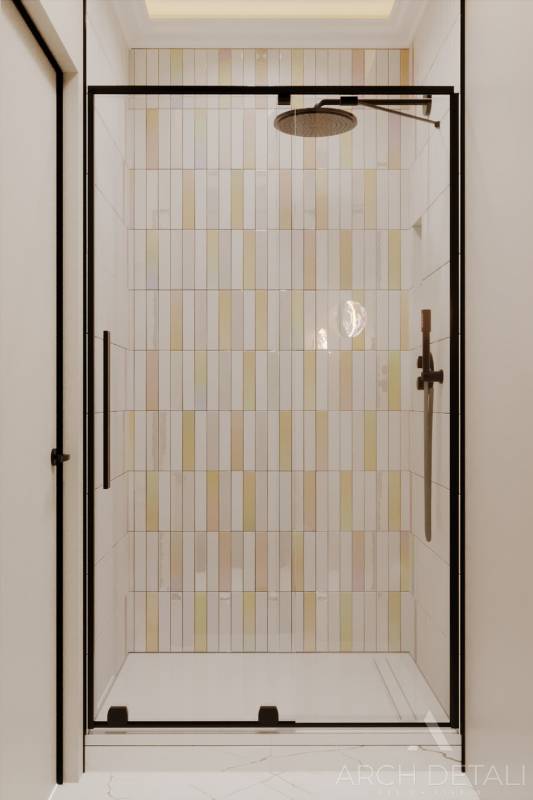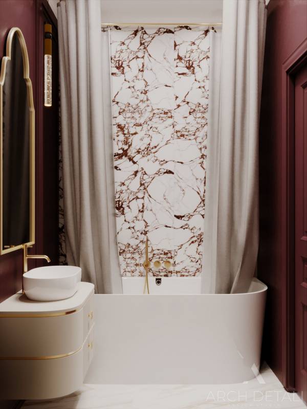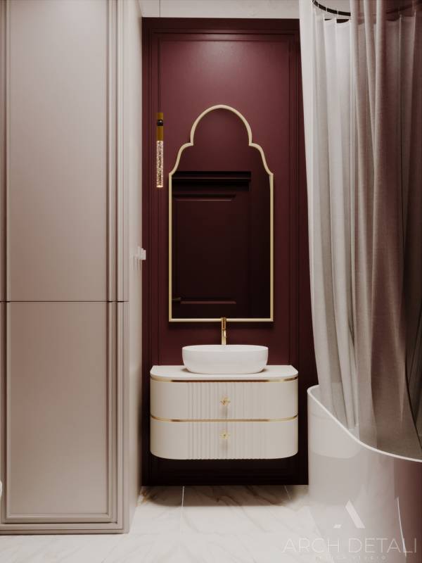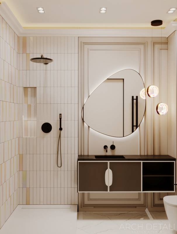 В ванных комнатах также создан микс стилистик в оформлении помещений: крупноформатный керамогранит с текстурой мрамора, покраска и молдинги на стенах создают настроение классики, сдержанные минималистичные формы мебели и сантехники добавляют современности в эклектичный интерьер.