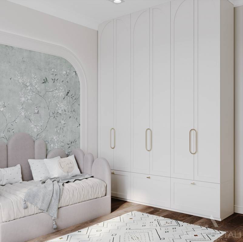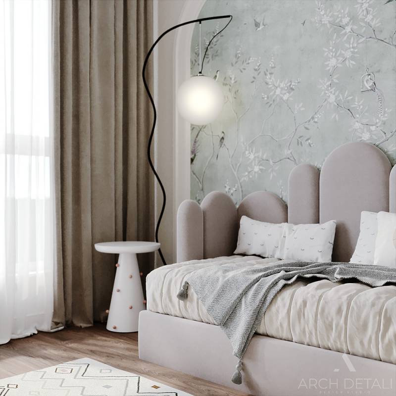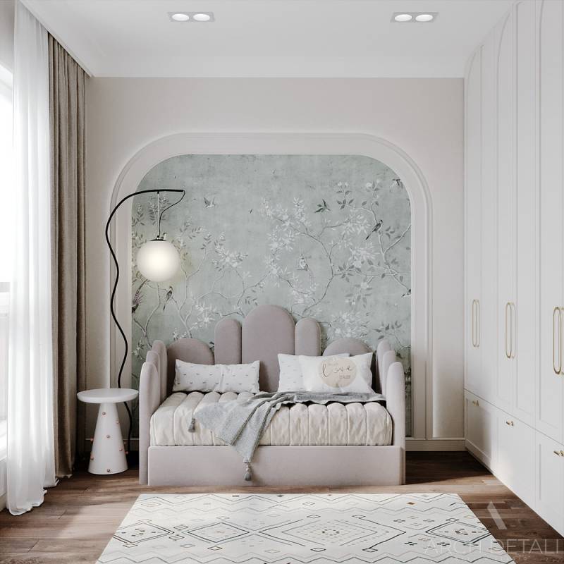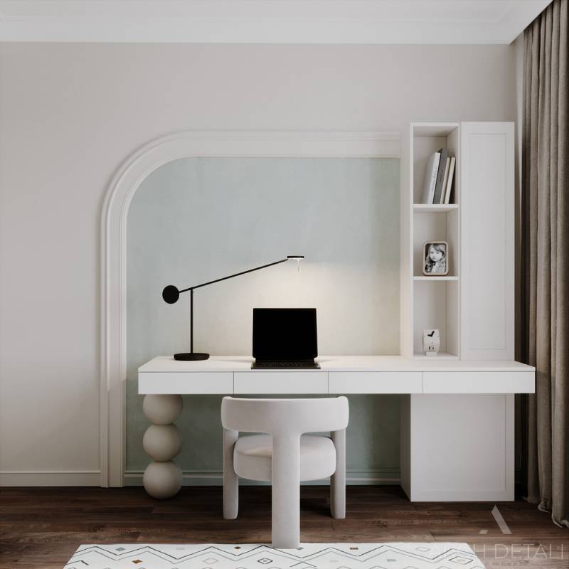 Молодежная комната светлая воздушная, легкая. При этом добавлена массивность в формах мебели. Массивная, в виде больших бусин, ножка у рабочего стола. Широкие молдинги на стенах в оформлении арочных ниш. Массивная фурнитура.