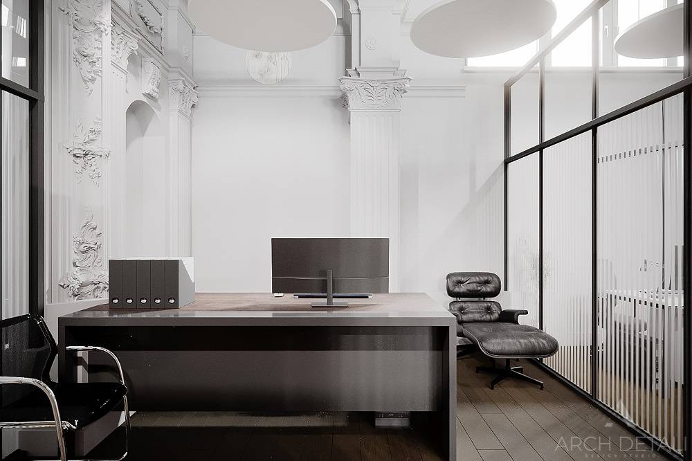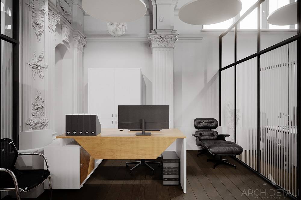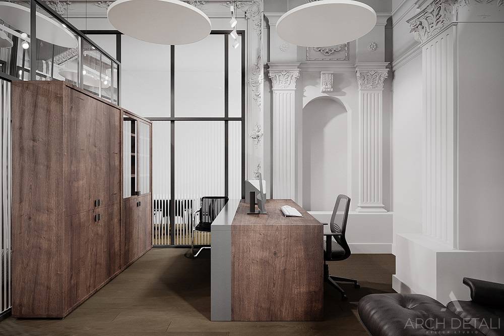 Уютный и функциональный дизайн-проект кабинета руководителя в классическом стиле. Тщательно проработана эргономика рабочего места. Использованы качественные отделочные материалы, мебель из натурального дерева. Особое внимание уделено освещению - настенные светильники, настольные лампы. Пространство разделено на зоны для работы, приема посетителей и отдыха. Оформление в сдержанной цветовой гамме с оттенками коричневого и бежевого.