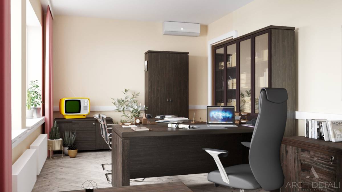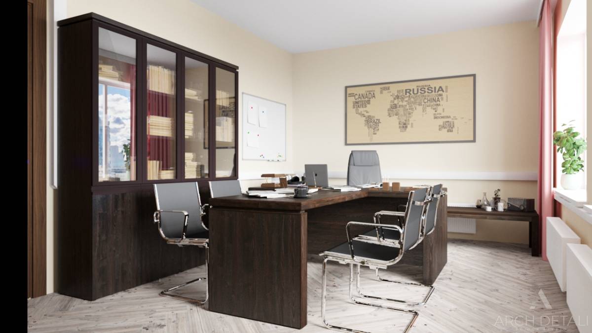 Офис в классическом стиле с элементами барокко для юридической фирмы. Парадная зона приема клиентов с ресепшен. Кабинеты для переговоров с респектабельным оформлением. Рабочая зона с удобными столами и освещением. Использование панелей из натурального дерева, лепнины, мягкой мебели. Строгая цветовая гамма коричневых и бежевых тонов. Данный дизайн подчеркивает солидность и статусность компании.