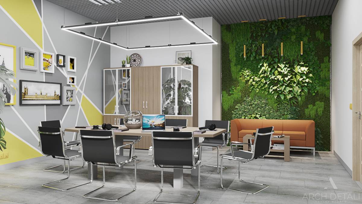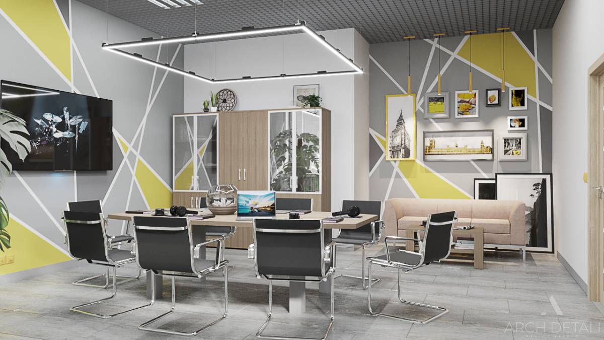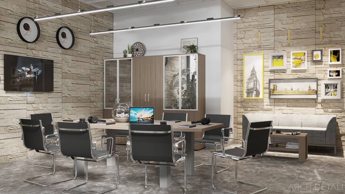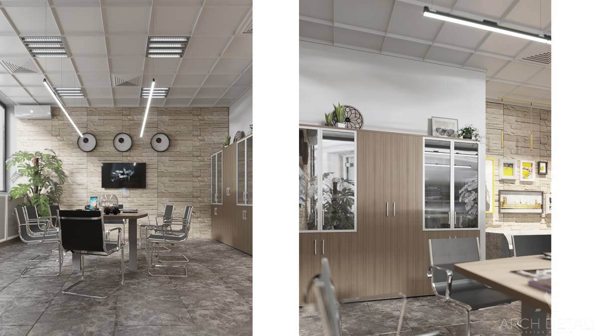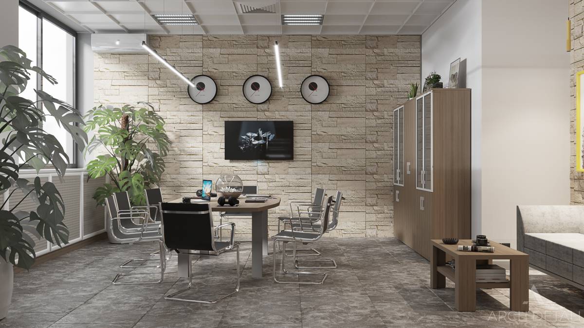 Современный дизайн-проект офиса в стиле минимализм с элементами лофта и использованием натуральных материалов. Просторный интерьер с зонированием пространства. Рабочая зона оснащена удобными столами и креслами. Зона переговоров с минималистичным столом и стульями. Кухня-столовая в едином стилевом решении. Ненавязчивая цветовая гамма серого, белого, черного. Интересные декоративные элементы: кирпичная кладка, металлические опоры.